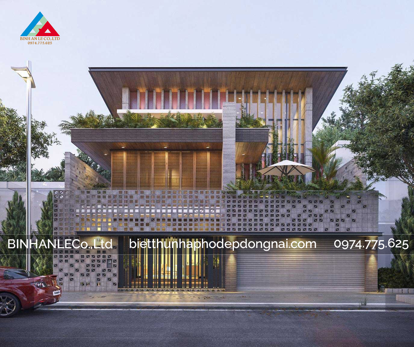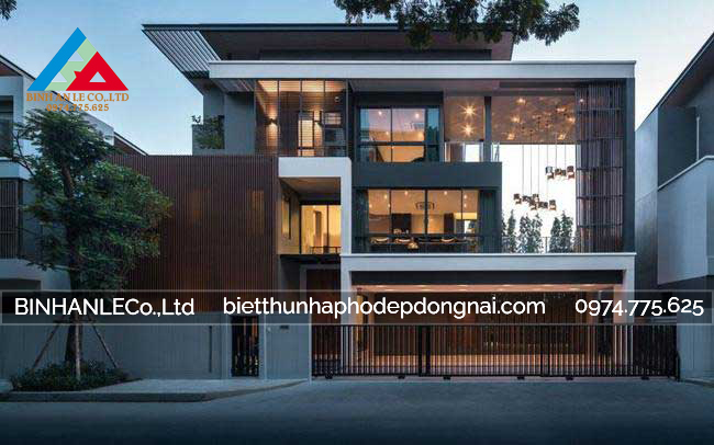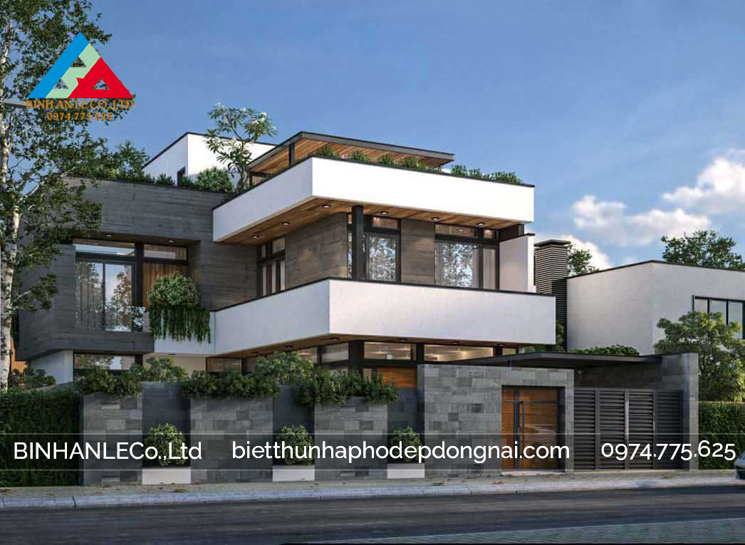 Đây là một thiết kế biệt thự 3 tầng mang phong cách hiện đại được ưa chuộng ngày nay. Do quỹ đất bị hạn chế nên không có diện tích sân vườn như các thiết kế biệt thự thông thường. Những kiến trúc sư đã khéo léo tận dụng từng khoảng không gian bao quanh mặt ngoài của ngôi nhà để tạo không gian xanh mát qua giải pháp vườn cây di động. Mẫu thiết kế này cũng sử dụng rất nhiều đồ nội thất gỗ tạo cảm giác gần gũi với thiên nhiên. Cấu trúc xây dựng là sự liên kết của nhiều khối hình học tạo ấn tượng mạnh mẽ, chắc chắn.