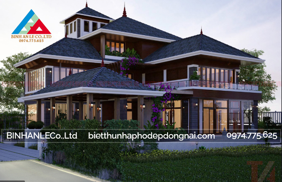 Mẫu thiết kế pha trộn giữa kiến trúc Thái Lan và phong cách cổ điển châu Âu. Diện tích sân vườn bao quanh lớn và có chủng loại cây cỏ hết sức phong phú vừa có công năng trang trí, tạo không khí thoáng mát, an nhiên vừa là nguồn thực phẩm phục vụ cuộc sống hàng ngày. Nổi bật ở trung tâm là thiết nhà nhà ở 3 tầng mái thái màu trắng tinh khôi, sang trọng