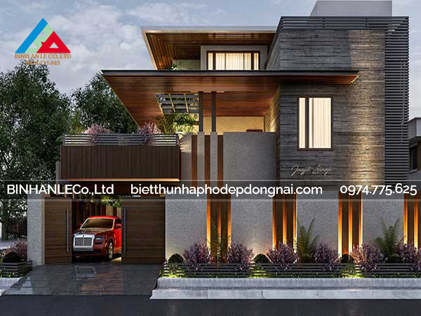 Đây là một trong những kiểu biệt thự mini 3 tầng đẹp mà bạn có thể tham khảo cho không gian sống của mình. Kiến trúc nổi bật từ gỗ và đá tạo nên vẻ đẹp độc đáo và thu hút. Không gian được thiết kế như một bậc thanh từ thấp lên cao, không gian bên trong với bên ngoài đan xen ngau vô cùng hài hòa. Tầng trệt được thiết kế gara ô tô vô cùng tiện lợi. Bên ngoài cổng thiết kế bồn cây, đèn hắt sáng giúp cho ngôi nhà trở nên lung linh vào buổi tối.