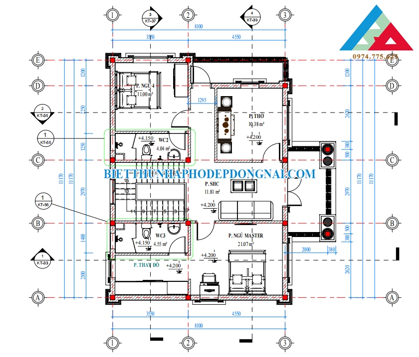 + Phòng ngủ master: 21,07m2 + nhà vệ sinh khép kín 4,55m2 + phòng thay đồ