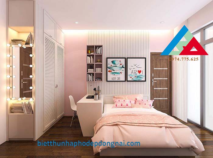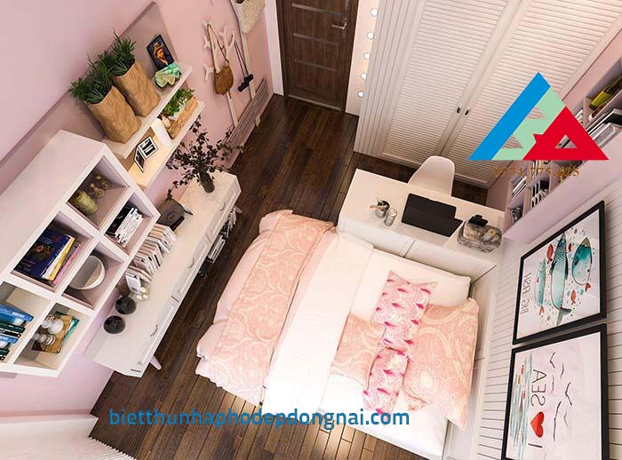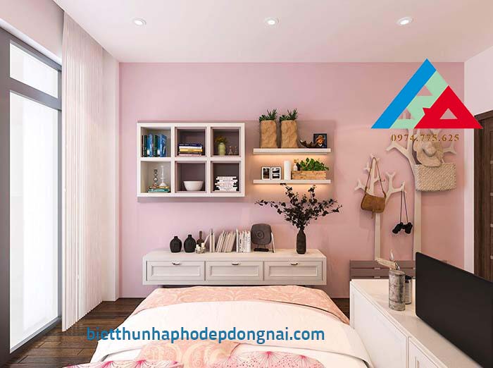 Phòng ngủ dành cho cô con gái sử dụng gam màu hồng nhẹ nhàng, không quá sến, và hơn hết là phù hợp với lứa tuổi cũng  như sở thích của cô con gái. Tranh treo tường đầy vui tươi, thích hợp với sở thích của con trẻ.