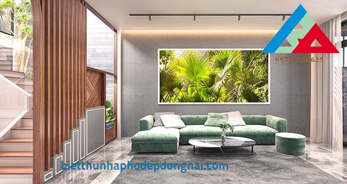 Bức tranh treo tường được lựa chọn vô cùng khéo léo, như mang cả thiên nhiên vào cả căn phòng khách. Bộ sofa được sử dụng chất liệu nhung, mềm mại và êm ái.