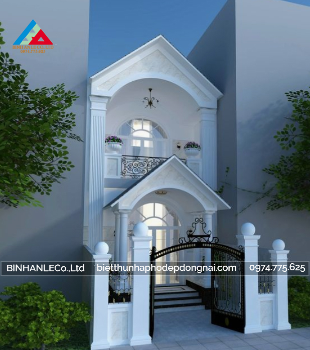 Kiến trúc mặt ngoài của căn nhà được thiết kế theo lối tân cổ điển được  trang trí bởi các thước cột và hoa văn châu âu sang trọng cầu kì đẹp mắt . Tông màu chủ đạo là màu trắng tinh tế , nhã nhặn . mặt tường được sơn trắng và ốp đá trắng nhẵn mịn . Cổng vào , lan can hay đèn đều thống nhất 1 pong cách thiết kế hoa văn châu âu cổ .